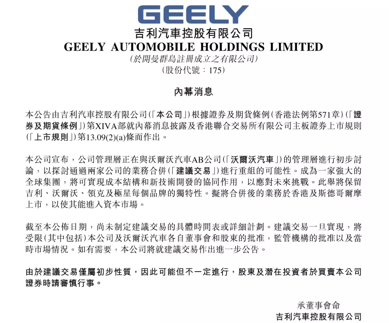 吉利汽车控股有限公司(HK.0175)10日发布公告称,管理层正在与沃尔沃汽车AB公司的管理层进行初步讨论,以探讨通过两家公司的业务合并进行重组的可能性。