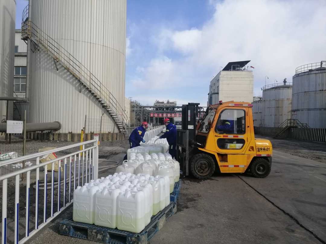 包头市海平面高分子有限公司罐装次氯酸钠消毒液现场。(受访企业供图)