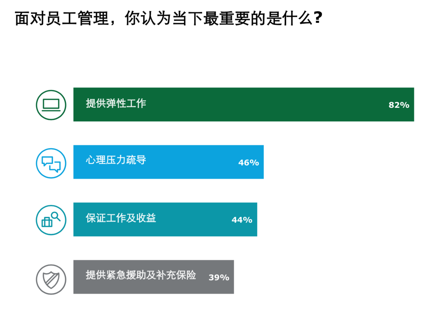 不同性质的企业,面对疫情的管理重点也有所不同。《报告》指出,参与调研的制造型企业在提供弹性工作以及提供在线工作环境中遇到的阻力最大,管理重点侧重于提供针对疫情的防控措施,保证工作现场的环境安全;90%的外资企业认为向员工提供弹性工作方式是面对疫情的当务之急;超过一半的政府及公共服务单位将“心理压力疏导”作为现阶段的员工管理重点。