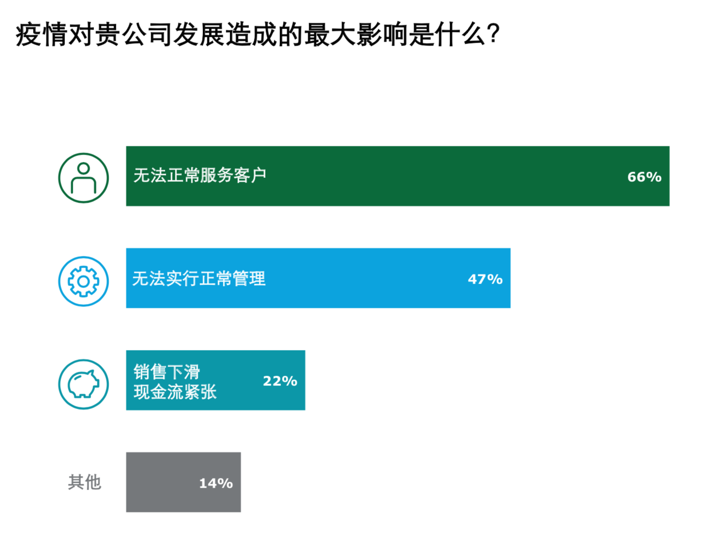《报告》发现,企业性质不同,受到疫情带来的影响也随之不同,民营企业认为影响最大的是销售下滑所带来的现金流紧张。消费行业、金融服务、地产行业及教育行业因受到疫情影响无法正常服务客户,而能源、资源及工业行业认为此次新型冠状病毒所带来的企业管理影响最大。还有不少企业担心节后员工返工困难、原材料/辅料运输受阻、欠缺可支持员工远程办公的软硬件系统条件,以及担心公司管理层危机意识不足。