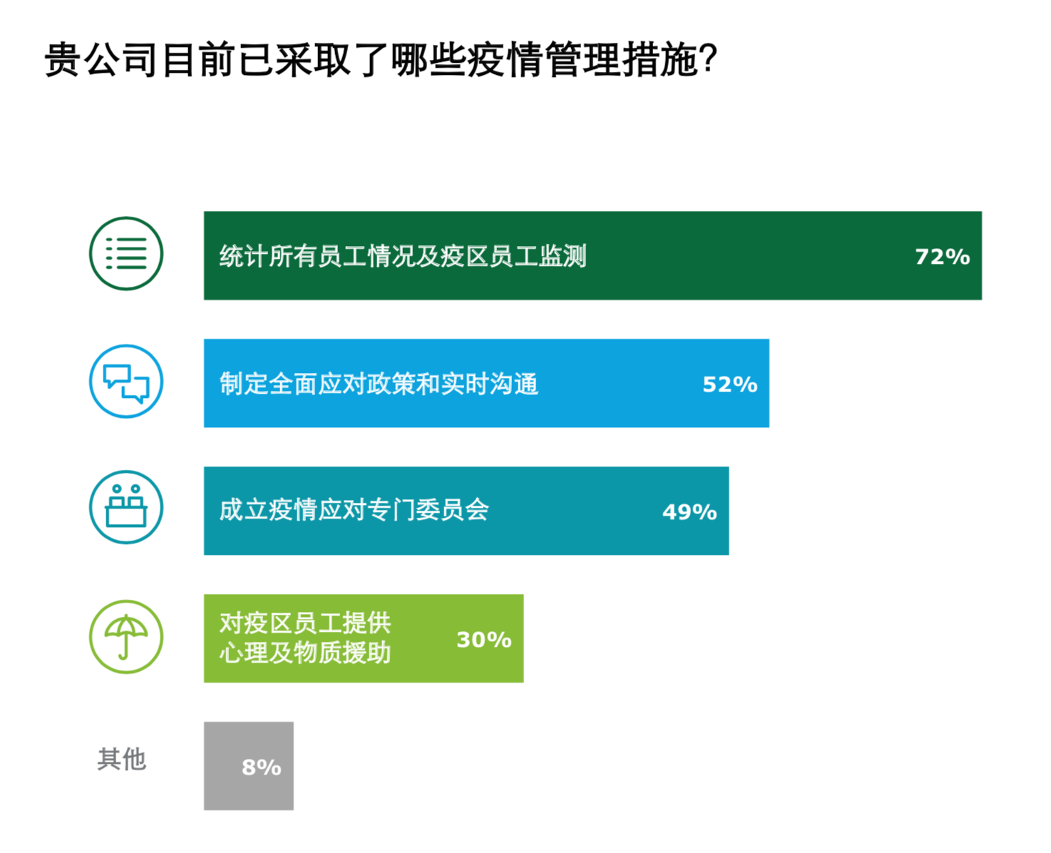 受调查企业为了疫情防控均采取了一系列措施。《报告》指出,外资企业在制定全面应对政策和实施沟通以及为疫区员工提供心理及物质援助方面行动最快;国企/央企在第一时间统计所有员工情况及疫区员工监测,并成立疫情应对专门委员会;另有企业为应对疫情,为员工购买相关体温监测、病毒防护等医用器具,并通过邮件等线上通讯平台跟踪员工身体健康状况及发布相关疫情预警信息。《报告》建议在疫情期间,应当格外注意加强公司层面对于员工的日常沟通,沟通可包括疫情通报或疫情防控、心理援助等,增强员工对企业的信赖感,并为之后的工作做好准备。