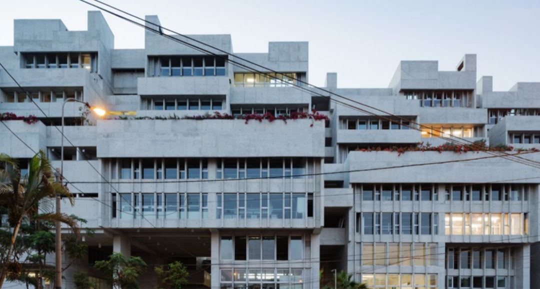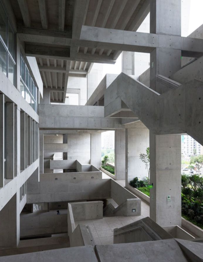 较大的体量区域贴近地面,教学、行政区域和教师的办公室在更高楼层交错分布。靠近屋顶的上层空间是图书馆,城市和大海的全景在此尽收眼底。统而言之,这是一座以垂直的纵向形态为独到特色的校园建筑,与当地的温带气候环境相得益彰,也对秘鲁的地形条件与城市传统有所借鉴。