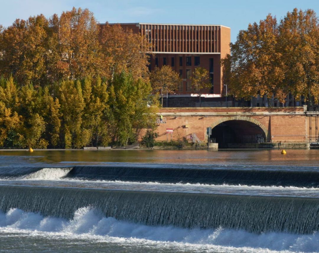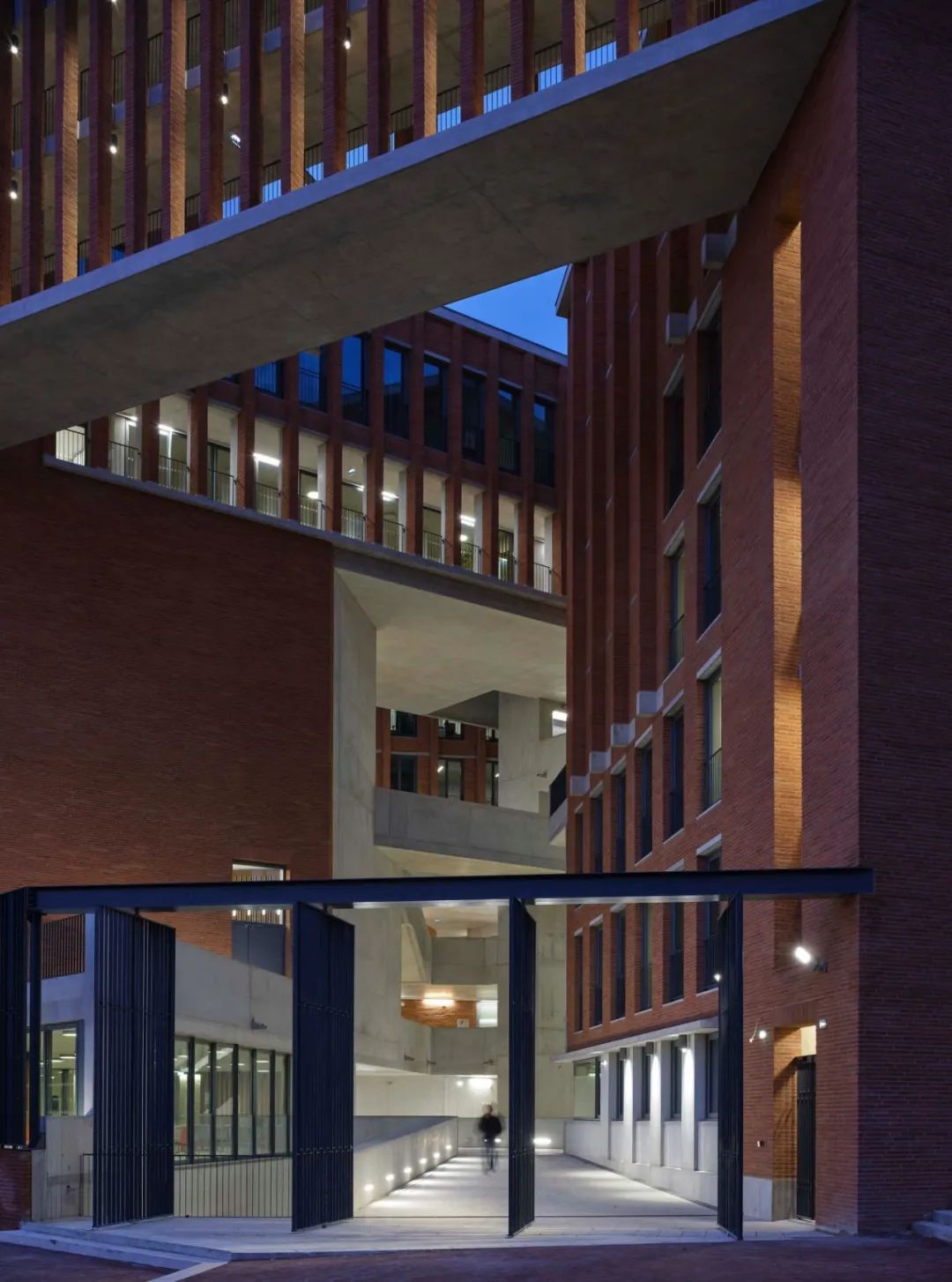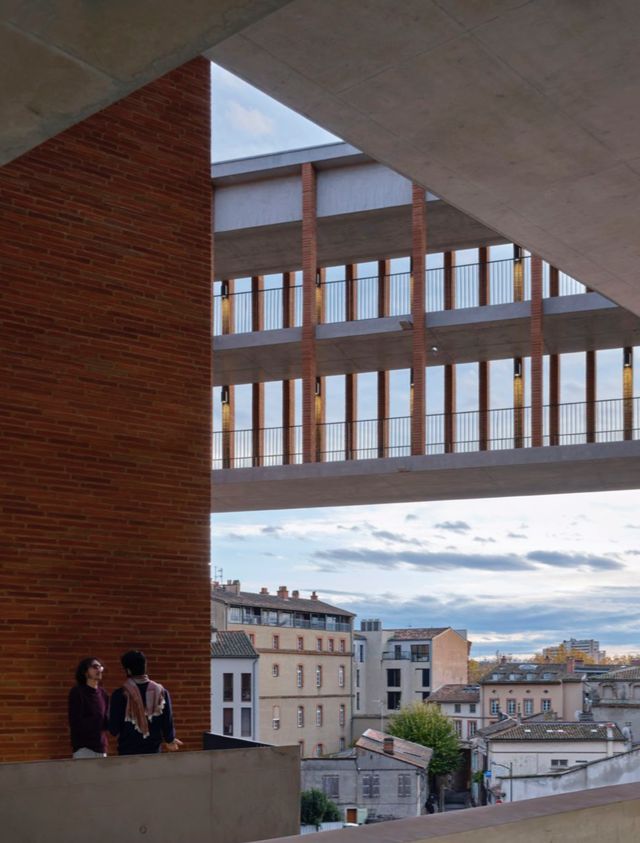 图卢兹第一大学经济学院位于加龙运河的一处转弯,依建筑师的解读,这座地上七层地下两层的新建筑,“扶壁、墙体、坡道、酷炫神秘的内饰、回廊和庭院.....这些是重新诠释的图卢兹元素的整合。”