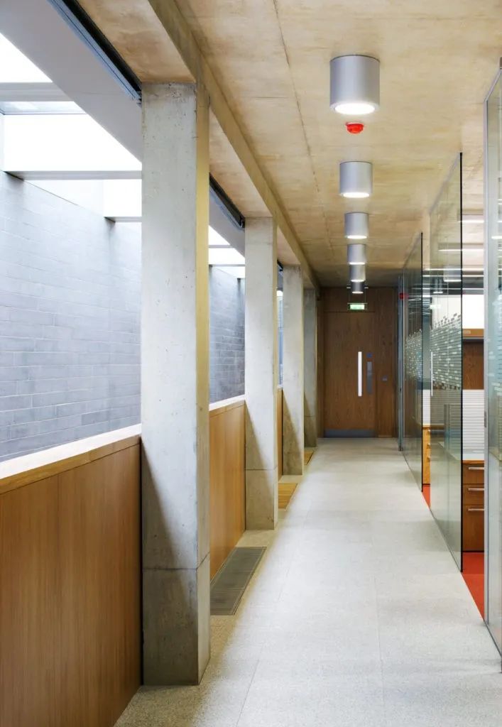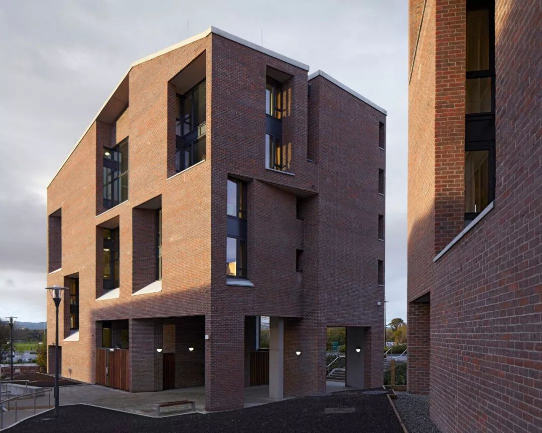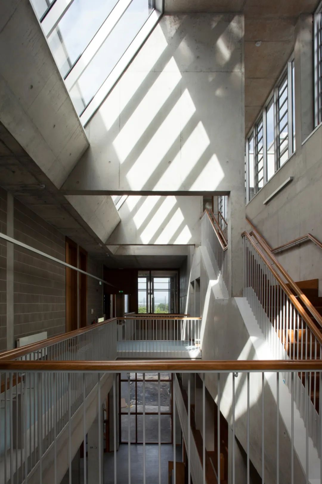 都柏林大学爱尔兰城市研究院位于整个校园建筑群的边缘,陶瓦、红砖和花岗岩基座构成了这座可持续建筑的“工艺表皮”,材质的对比变化营造出整座建筑的视觉趣味。建筑首层为两层通高,由实验室和研究室组成,从东西方向上的分层来看,上层的天窗朝向西北整齐排布,形成一组对比鲜明的窗格,产生了令人惊叹而有趣的空间复杂性。