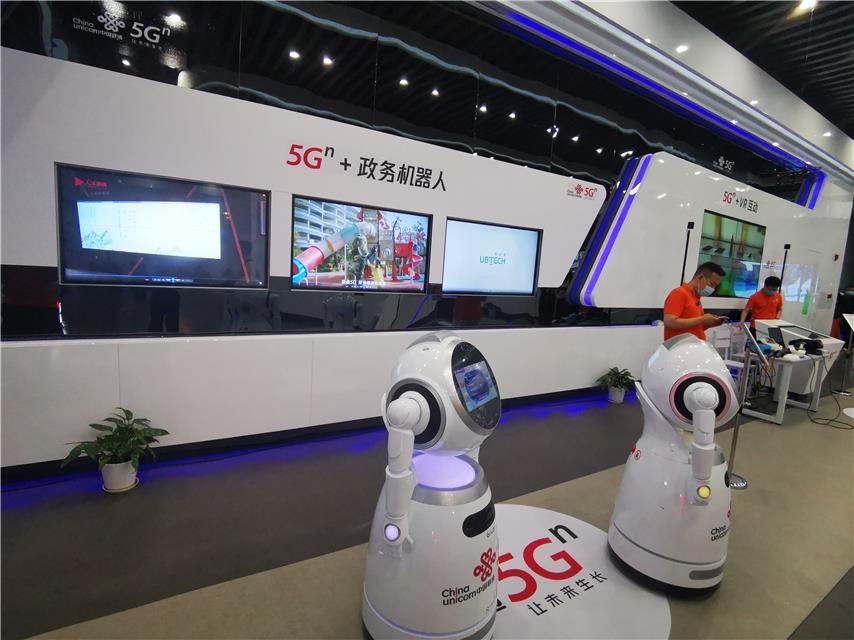 龙岗区5G网络全覆盖暨全景展示体验活动启动仪式现场展出的5G政务机器人。