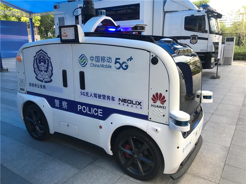 龙岗区5G网络全覆盖暨全景展示体验活动启动仪式现场,5G无人驾驶警用车亮相。