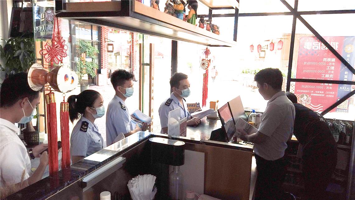 ↑图为龙华区税务局党员税法宣传队走进餐饮商铺宣传税收优惠政策。