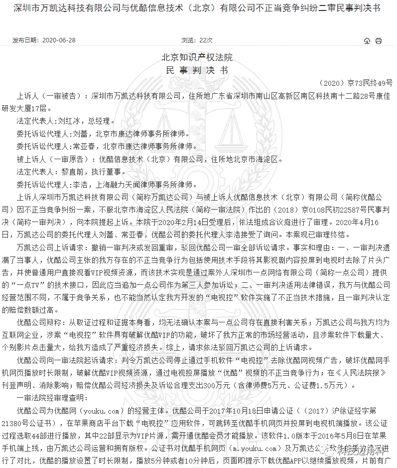 据北京知识产权法院微信公众号“知产北京”,诉讼双方是优酷和万凯达公司,后者经营了一款叫做“电视控”的软件,可将手机中播放的视频投屏到电视观看,同时屏蔽原视频片头的广告,而且普通用户也可以直接观看优酷VIP视频资源。