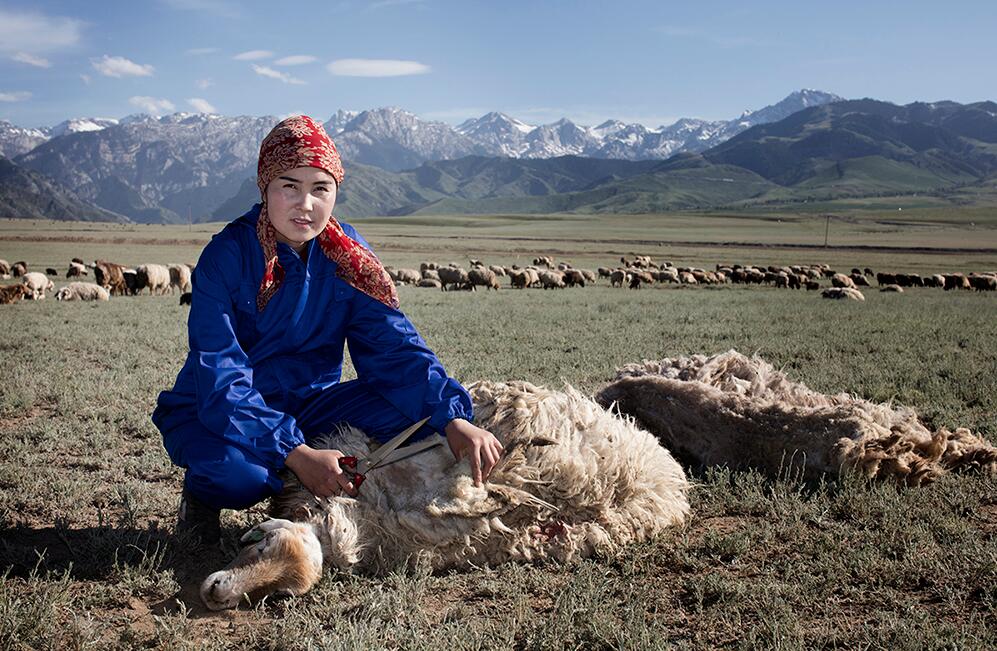 ↑燕苍娜女工摄影作品之一、位于新疆伊宁县的农牧公司剪羊毛女工。