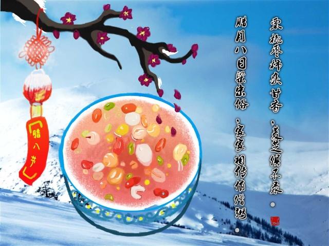 “腊八”,即农历十二月初八,古人有祭祀祖先和神灵、祈求丰收吉祥的传统。“腊”的含义有三:一曰“腊者,接也”,寓有新旧交替之意;二曰“腊者痛猎”,指田猎获取禽兽好祭祖祭神;三曰“腊者,逐疫”,即有祛除疫鬼之意。