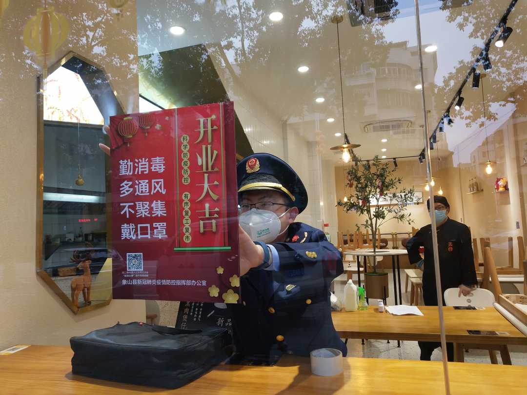 21日,宁波市象山县市场监管局执法人员为贤庠镇香满坊快餐店张贴上“开业大吉”特定标识。“我在店里填了材料,政府还给我带来生意,必须要尽快开张。”快餐店老板娘吴瑞亚说。