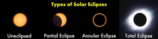 日食未发生时、日偏食、日环食和日全食的可视图