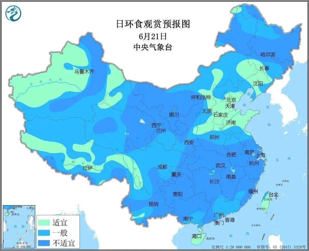 但总体来说,21日全国大部分地区的天气条件是不太利于日环食观测的。华北、黄淮、西北地区东部、云南等地相对较利于观测,而西南地区东部、江汉、江南北部、江淮南部有明显降雨,不利于观测,观赏日食需注意防雨。