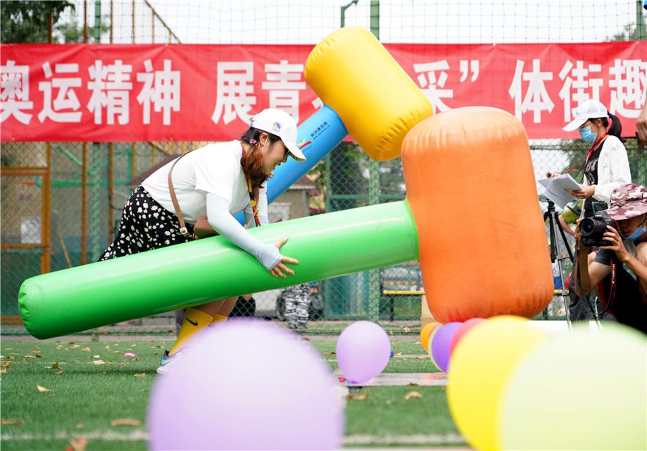 图为8月6日,北京市体育馆路街道正在举行青年趣味运动会。