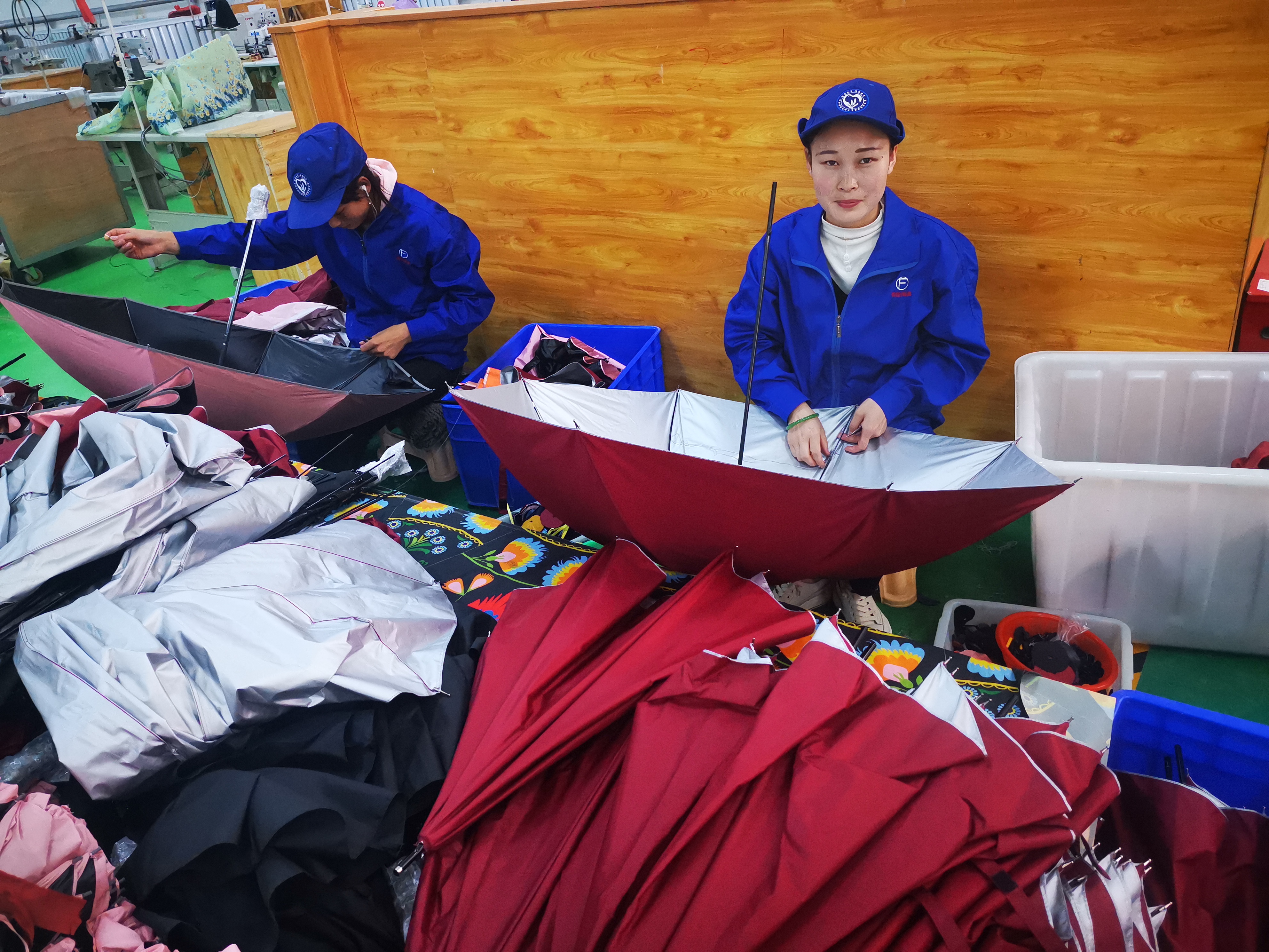 在甘肃省临夏州东乡县美佳雨具扶贫车间,28岁的马艾西正在忙碌着,她是车间组长,除了指导新员工制作外,捆线、修整返修的雨具是她的主要职责。