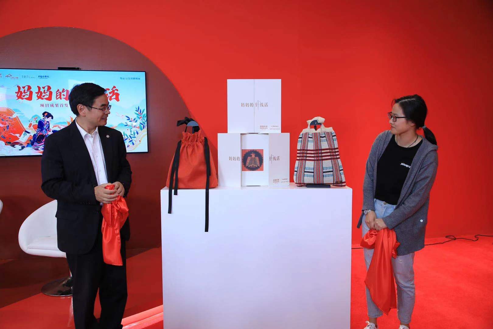 在活动现场,首批产品获得一致好评,由西部地区妇女生产的“妈妈的针线活”首批产品包袋在淘宝直播间开卖,成品手袋、设计团队提供的项目制作样品、上海大学、上海美术学院、上海公共艺术协同创新中心和深圳职业技术学院艺术设计学院提供的非遗文创产品一同进行展出,活动吸引了不少游客驻足观看、拍照与互动。