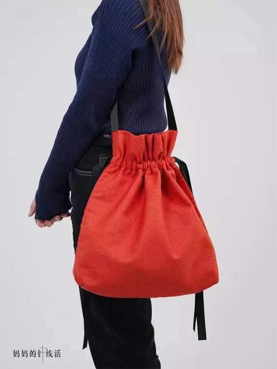 《灯笼》系列,彝族的传统颜色以红、黑、黄为主,设计者以红色为灵感设计了这个具有中国民族传统特色的包包,用回收的旧窗帘清洗消毒再加工完成了这款包包的设计制作,面料为粗布。包身是以代表中国特色的灯笼为灵感设计的,体现出大国之美。
