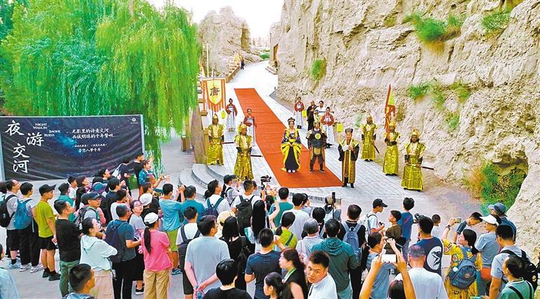 通过创新丰富旅游业态,是吐鲁番活化利用交河故城的重要思路。利用光影艺术打造的夜游交河项目,受到很多游客欢迎。随着暮色降临,一盏盏橘红色的牛皮纸灯和各式投影灯,点亮了座座建筑遗迹。在光影交织中,“边塞诗人”缓缓走来,深情讲述传奇的丝路故事,让夜游交河故城的游客走进了生动鲜活、有形有感的历史文化场景。